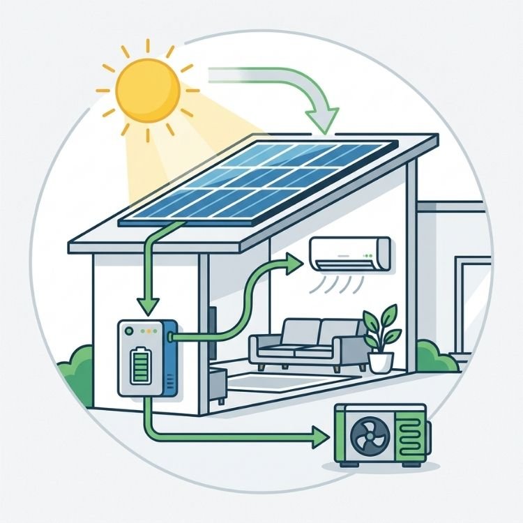 Wird die Klimaanlage mit Strom aus der eigenen Photovoltaikanlage betrieben, sinken die tatsächlichen Kosten deutlich, da der Strom direkt auf dem eigenen Dach erzeugt wird.